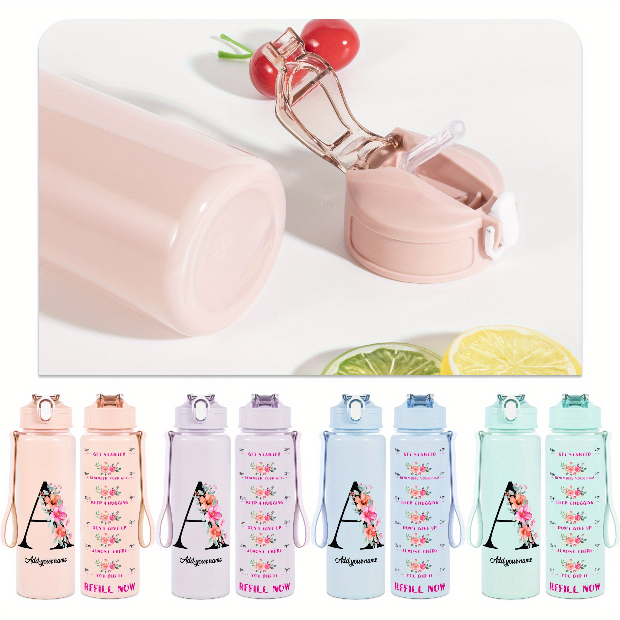 The bottle comes in a variety of vibrant colors and can be personalized with your name or other text, making it a great gift for friends, family, or even for yourself. It also features time markers that help you stay on track, ensuring you reach your hydration goals. The sleek design and leak-proof capabilities make it a must-have accessory for daily use.