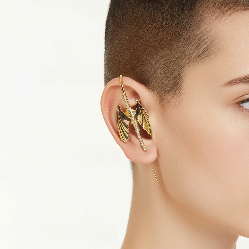 The Stormscale earring draws from classic dragon motifs found in myth and folklore. The sweeping wing shape reflects the dynamic movement often associated with powerful creatures, while the scale texture adds visual dimension. These structured details create a dramatic profile that stands out without excessive weight. The metallic finish highlights the sculpted contours, making the design suitable for both bold and understated ensembles. This earring appeals to individuals who seek accessories that hold symbolic or imaginative themes while offering refined craftsmanship.
